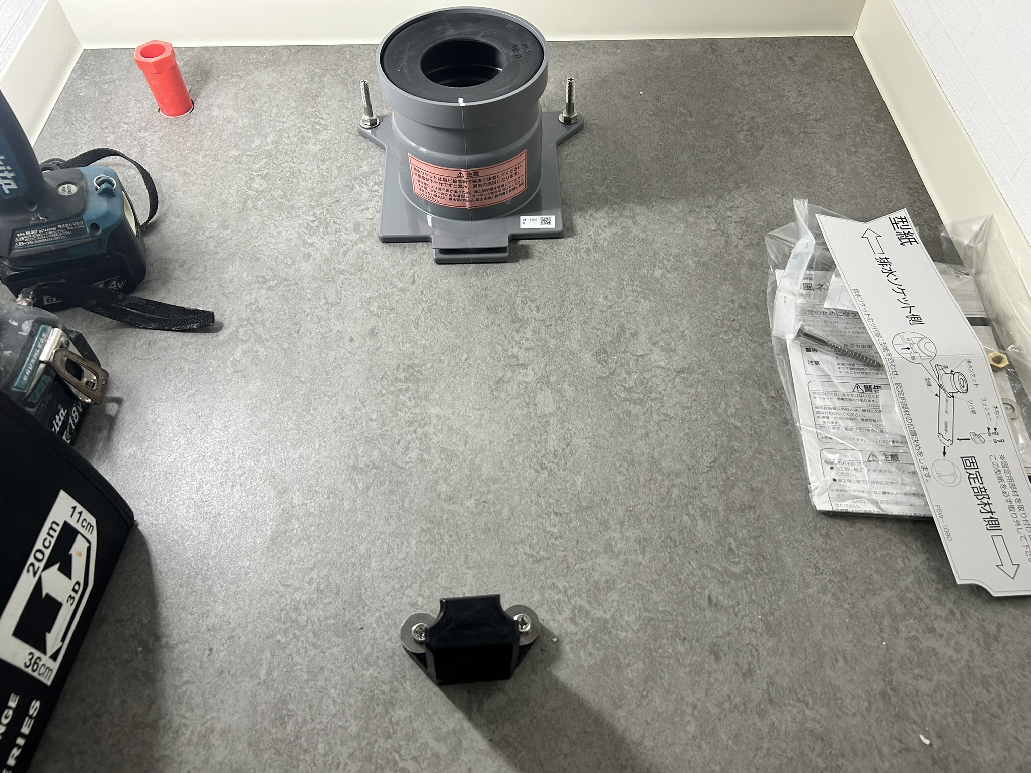 便器を設置するための部材を取り付けます。